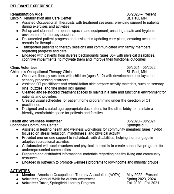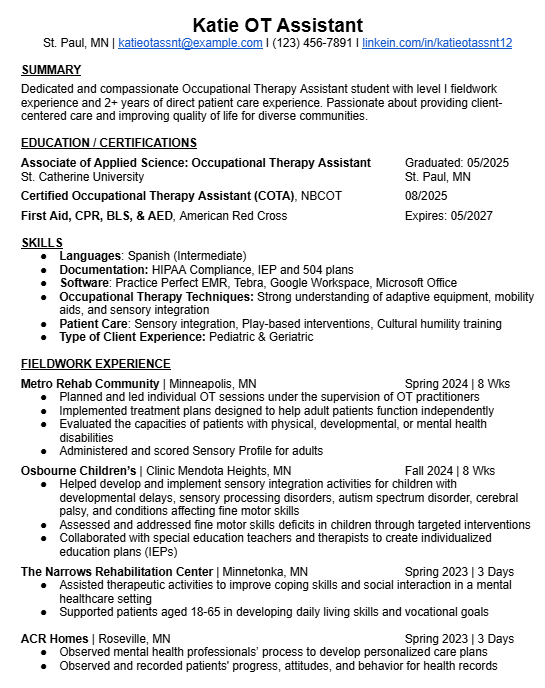 Occupational Therapy Assistant Resume Example